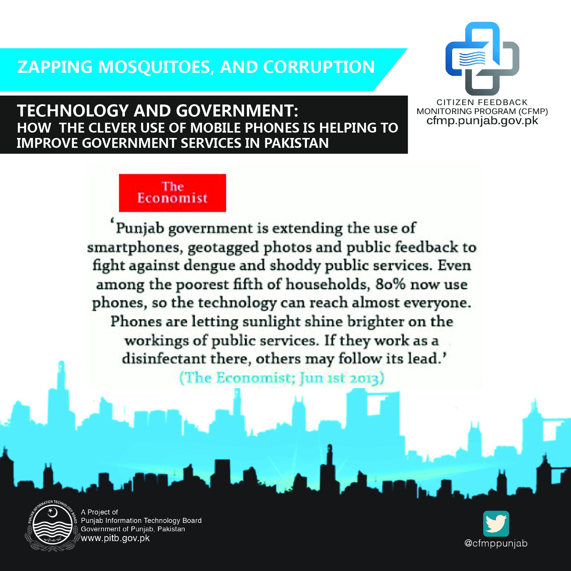 Punjab was hit with the worst ever epidemic of Dengue in 2011. Since then information technology centric interventions by Punjab Information Technology Department have been at the forefront to deal with such outbreaks. Three years down the line, field officers all across Punjab are equipped with smart phones to report surveillance activities on the move using Dengue Tracking System. More than twenty five provincial departments team up every year to fight vector borne disease and speed up surveillance/larviciding activities across Punjab. The campaign is now governed by third party validation. Special Branch carries out surprise visits at vulnerable areas and pinpoint larvae breeding spots, every potential threat is launched as a separate complaint in Electronic Complaint Routing System (ECRS) of PITB. Responsible department/agency resolves complaint per agreed Turn Around Time (TAT) and update complaint status with pictorial evidence.*