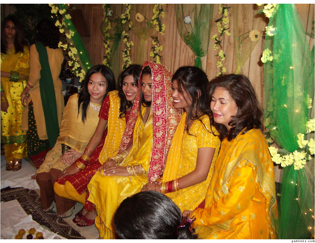 The main purpose of this occasion is that the bride stops doing any housework and start beautifying herself for the wedding. The groom’s mother brings ubtan for the bride which is applied to the bride’s skin each day leading up to the wedding to brighten the complexion. Along with other natural homemade beauty treatments regular oiling of the hair is also done. A milad is also held before the mayoon with special emphasis on the wedding. The actual party is for ladies only where they can sing and dance while the married females apply ubtan, do the oiling and tease the bride. ![]()