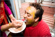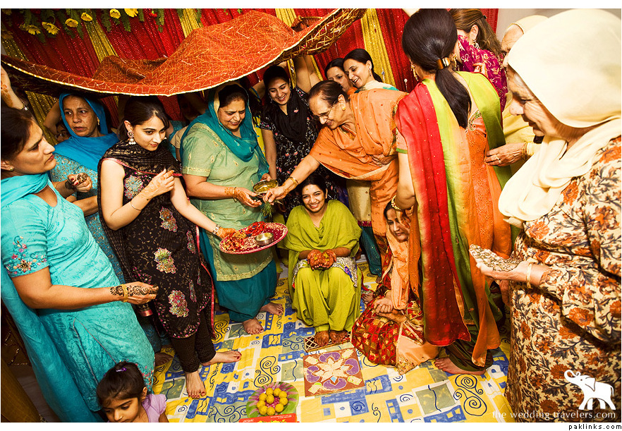 Mehndi -- Usually occurs a day later or even the evening following the mayun/manja. This is when the other side brings mehndi and does rasams for the bride/groom. Traditionally the bride and groom wouldn't see each other before the wedding, so there used to be two mehndis, one where the groom's side (but not the groom) took the mehndi to the bride's side and fed her sweets and one where the bride's side (but definitely not the bride) took the mehndi to the groom's side and fed her sweets, etc. Traditional colors are yellow, orange, and green.