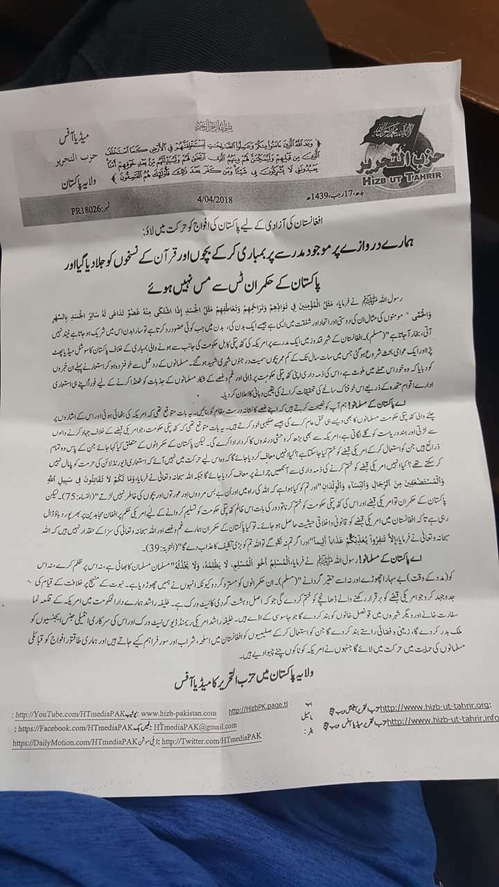 Hizb ut tahrir Pakistan openly distributed their pamphlets outside almost every Jamia Masjid of #**Lahore**](https://twitter.com/hashtag/Lahore?src=hash). I collected one from Gulberg today when I was passing by a mosque near SP model town Office Ghalib Market Gulberg. Just pray for the departed soul of #**NationalActionPlan**](https://twitter.com/hashtag/NationalActionPlan?src=hash)