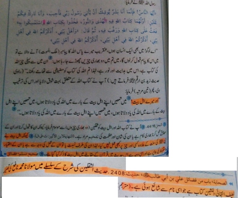He then said: One day Allah’s Messenger (may peace be upon him) stood up to deliver sermon at a watering place known as Khumm situated between Mecca and Medina. He praised Allah, extolled Him and delivered the sermon and. exhorted (us) and said: Now to our purpose. O people, I am a human being. I am about to receive a messenger (the angel of death) from my Lord and I, in response to Allah’s call, (would bid good-bye to you), but I am leaving among you two weighty things: the one being the Book of Allah in which there is right guidance and light, so hold fast to the Book of Allah and adhere to it. He exhorted (us) (to hold fast) to the Book of Allah and then said: The second are the members of my household I remind you (of your duties) to the members of my family.