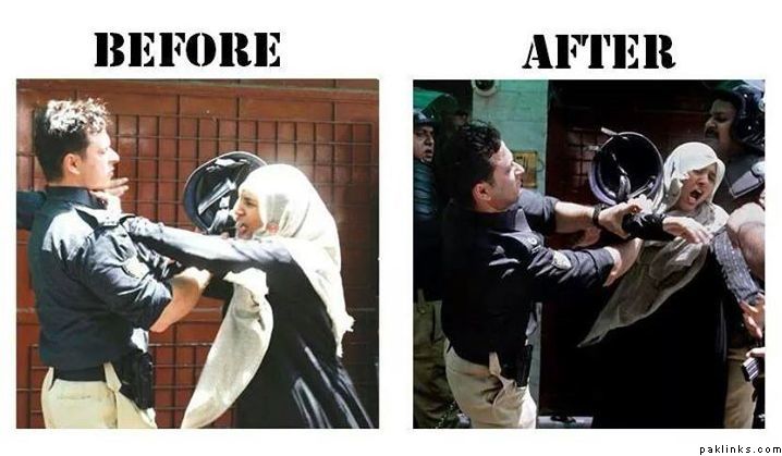 Everyone is sympathizing with the the females who were man handeled. These women were slapping and shoving the police officers and expecting that they back-off. This is nothing short of “ghundaa gurdee”. If they got manhandled as a result, it’s their own fault. The picture on the right has been repeatedly shown by the media but no one has shown what lead to it. The woman slapped and shoved the police officer repeatedly. He’s just trying to get her out of the way.