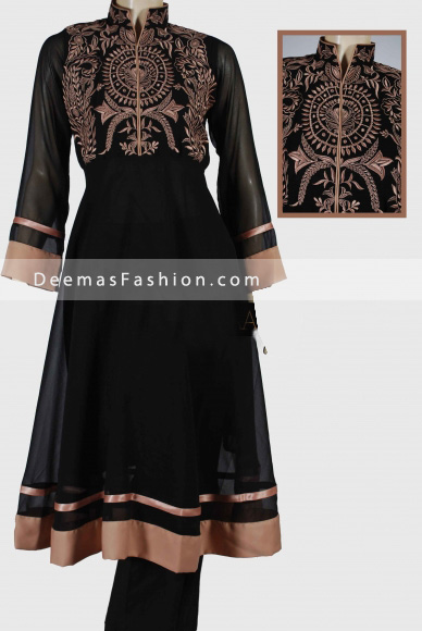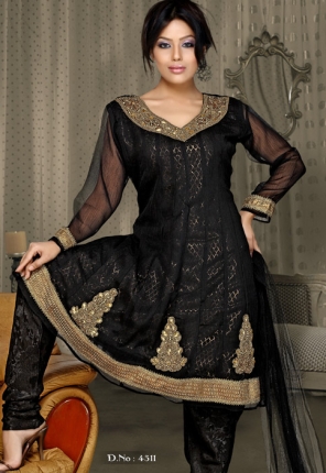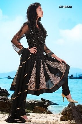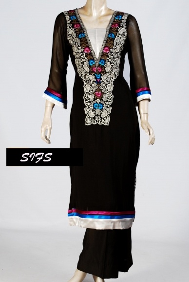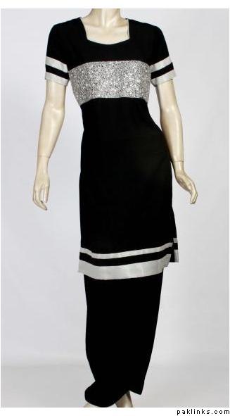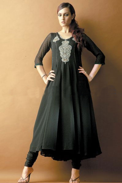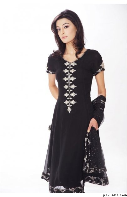 i have pure black chiffon cloth..i want to make light formal dress of it..most probably an A-line shirt or a frock.. plz post pics of black embroided v stylish dresses…thanx alot:)