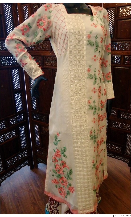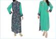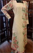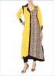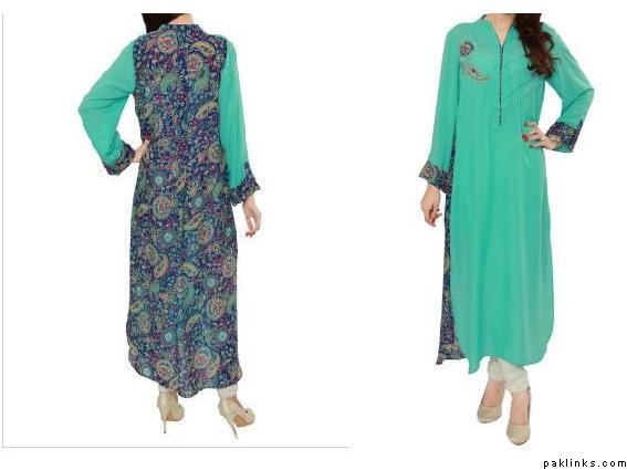 For styles - you could use this printed fabric for the front. Add a long yoke to the top of the kameez, in a plain colour on top, and the printed fabric as the bottom. Cut it A-line and split the centre of the kameez (printed fabric, at the bottom of the yoke) and insert a panel in the centre of the kameez in that plain colour contrast fabric. The plain fabric insert would be like a fold within the fabric, so it peaks through.