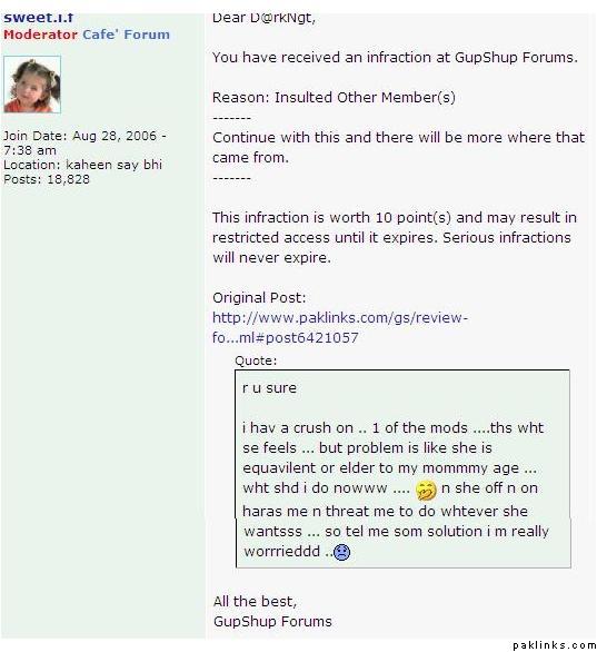 i hav a crush on .. 1 of the mods …ths wht se feels … but problem is like she is equavilent or elder to my mommmy age … wht shd i do nowww … n she off n on haras me n threat me to do whtever she wantsss … so tel me som solution i m really worrrieddd ..