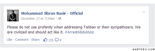 Jibran telling people to act civil and politely with Taliban sympathisers rather than wishing him to go to hell/shaming him or his family. Is he asking for death of Lal Masjid people? No he is not. He is speakiing out with his rights as a citizen to condemn their views and for this to be examined. After an arrest only the courts can decide be a person is to be charged and jailed.