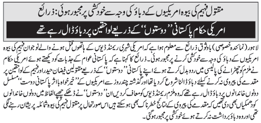 Well that might true but the bottom line is that Raymond Davis has the blood of 4 people on his hands: the 2 he murdered, 1 that was run over by the Consulate Van, and this widow.