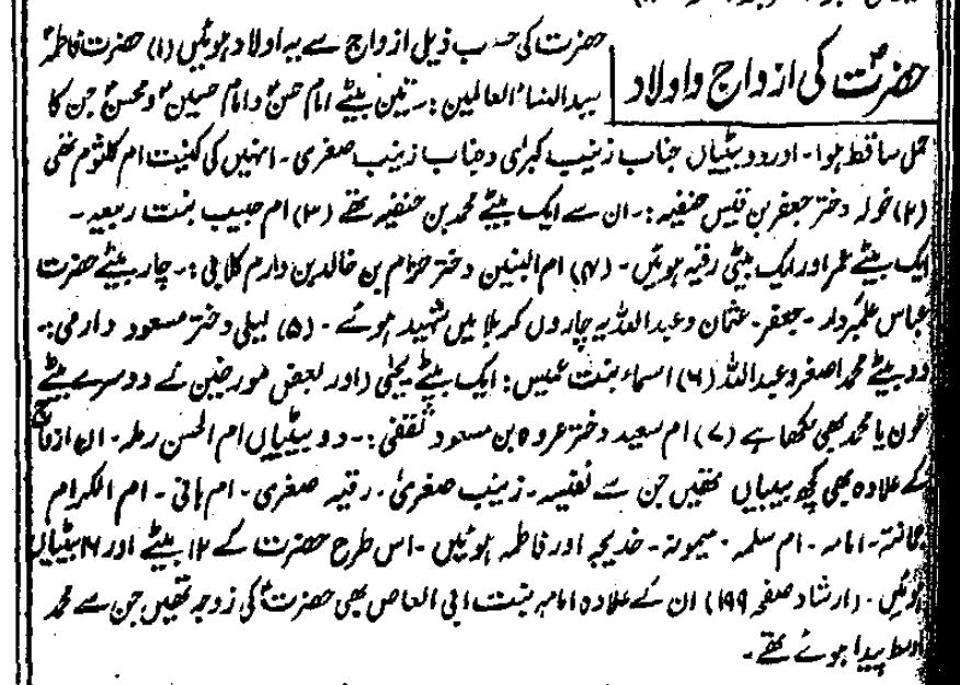 2 - Umm-ul-Bunian Bin Haram Bin Kalabia [she was related with Shimar Bin Zil Joshan (the alleged Criminal of Karabala){Ref: Jumhartul Ansab by Ibn Hazm}] who was the daughter of Hazam b. Khalid. Hadrat Ali had five sons from her, namely: Abdullah, Jafar, Abbas, Othman, and Umar. All of them were martyred in the battle of Karbala along with Hadhrat Hussain [May Allah be pleased with him].