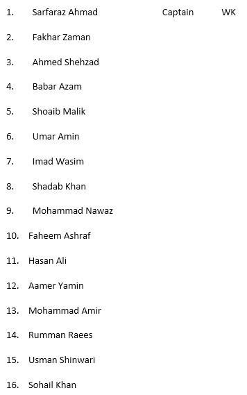 Sarfraz Ahmed (capt & wk), Fakhar Zaman, Ahmed Shehzad, Babar Azam, Shoaib Malik, Umar Amin, Imad Wasim, Shadab Khan, Mohammad Nawaz, Faheem Ashraf, Hasan Ali, Aamer Yamin, Mohammad Amir, Ruman Raees, Usman Khan, Sohail Khan.