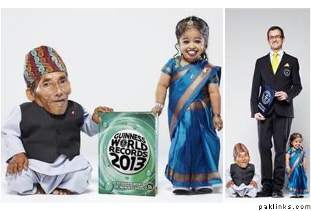 **The world’s shortest man, Chandra Bahadur Dangi, 72, and the world’s shortest woman, Jyoti Amge, 18, stand with a 1-foot-tall Guinness World Records book.