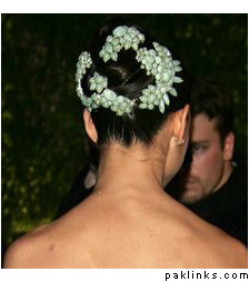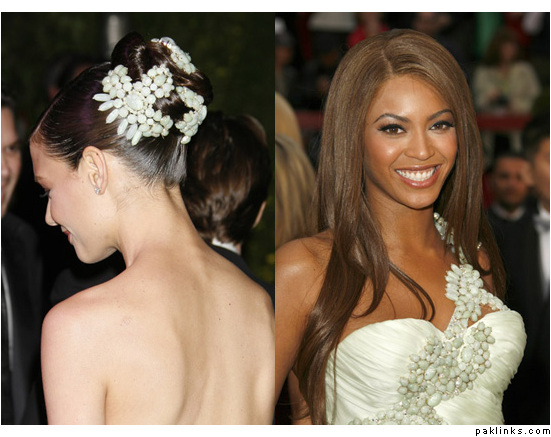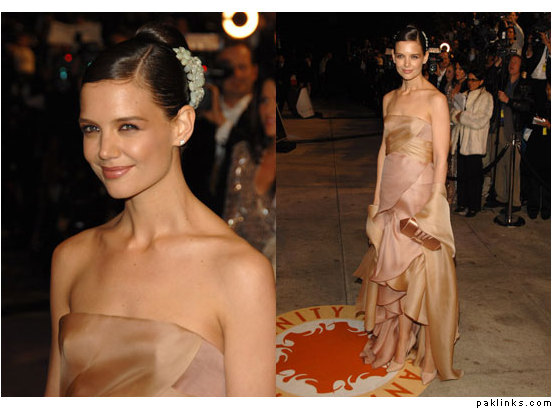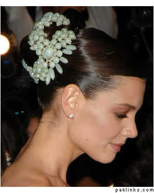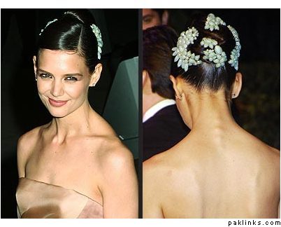 I don’t personally like the actual pieces worn by Katie Holmes but I like the idea, reminds me of a single circular hairpiece I saw at a fashion show once: