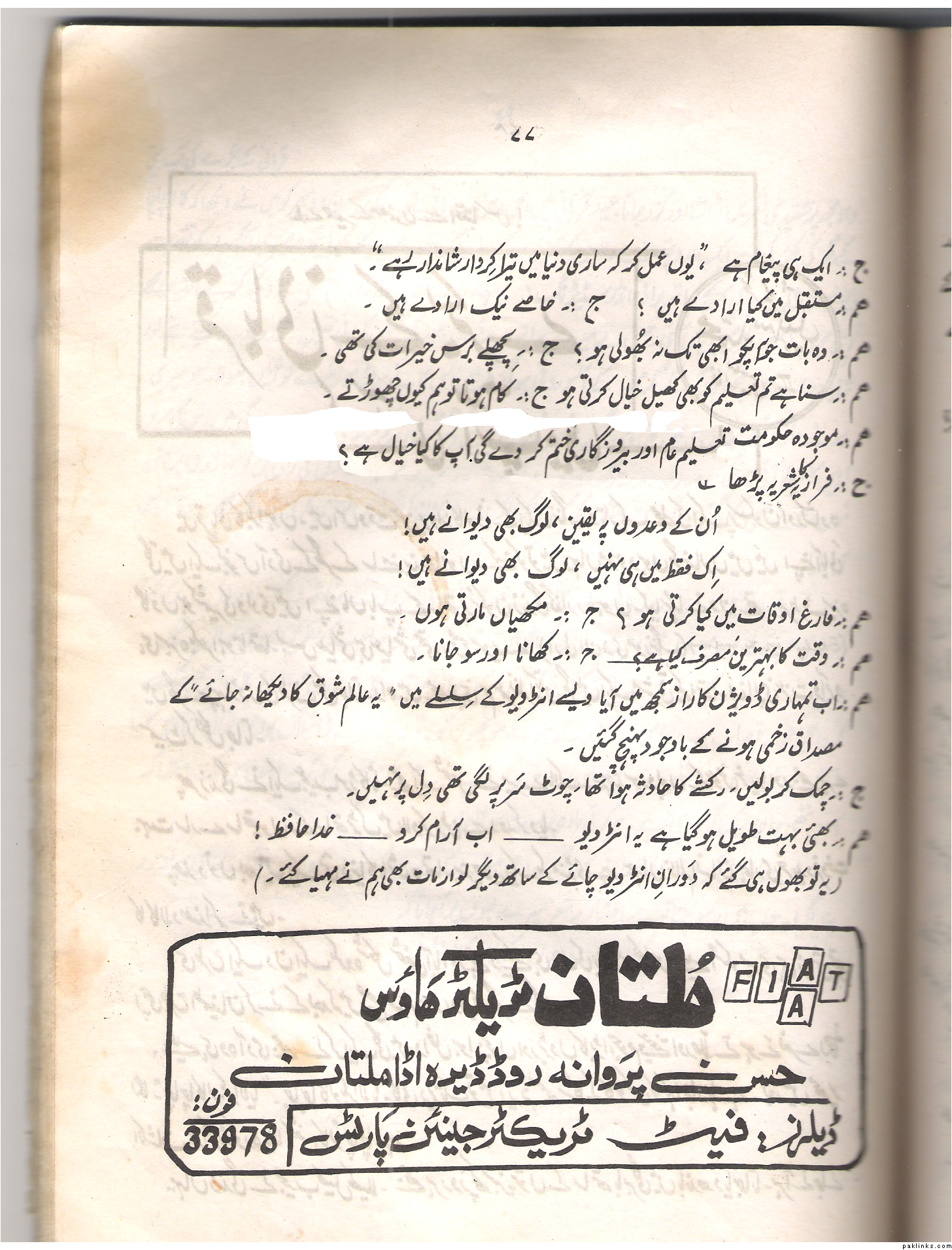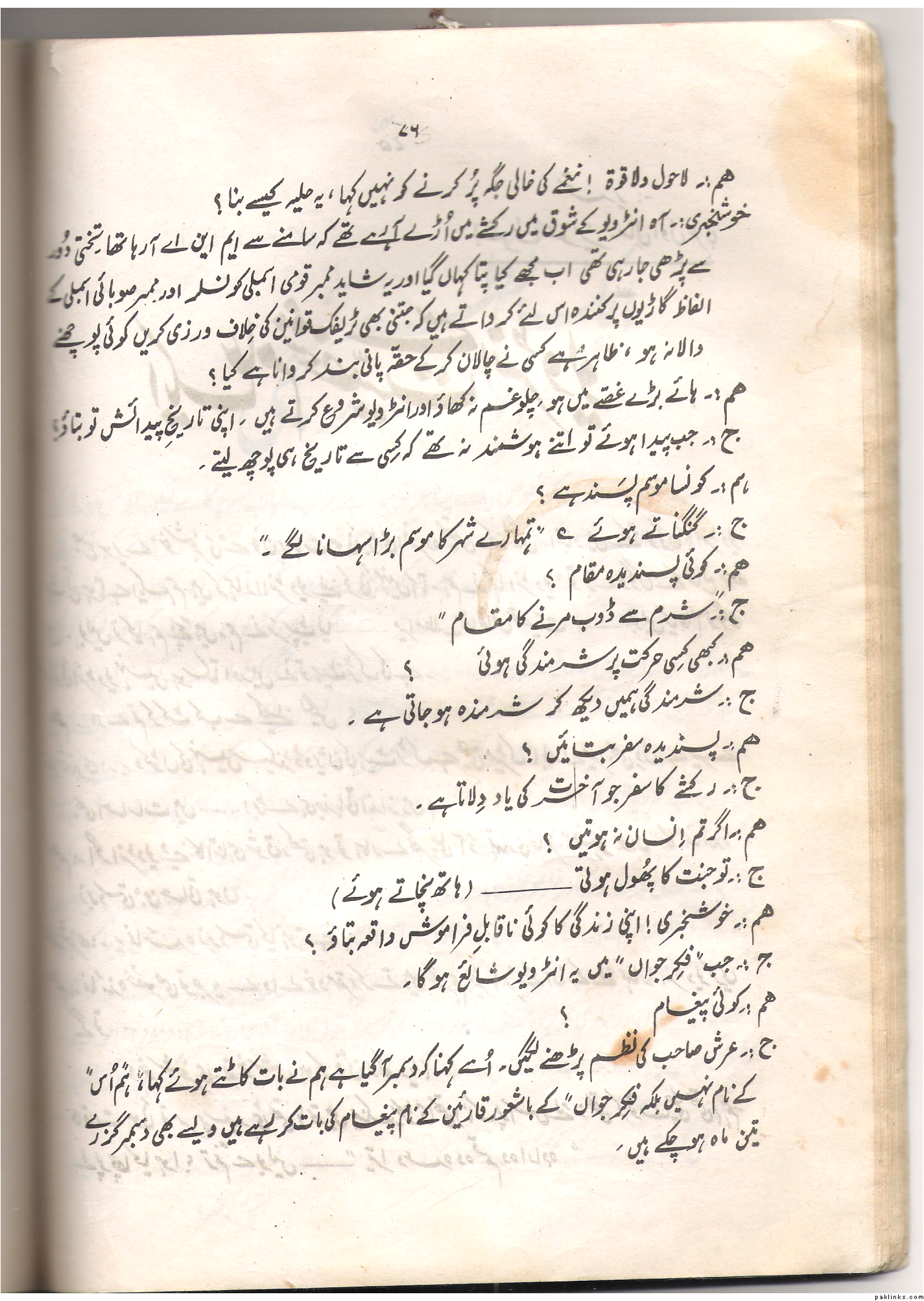 Well swal ke "Suna hai tum taleem ko bhi khyl khiyal kerti hu??? jwab tha "Agar khyl na hota tu ham perhty hi hoi??? Editor (hu ga koi kharoos {ab kis jais akahun GS ke kerta djertaon main se;)}) os ne jwab ker diya “tu ham chorty hi kion”