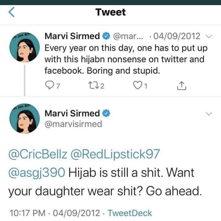 I wouldn’t wear hijab neither would i want any woman in my family to wear one but i still wont criticize other people’s choice. This bitch wears a bindi on her forehead. Cant someone please deport her to New Delhi.