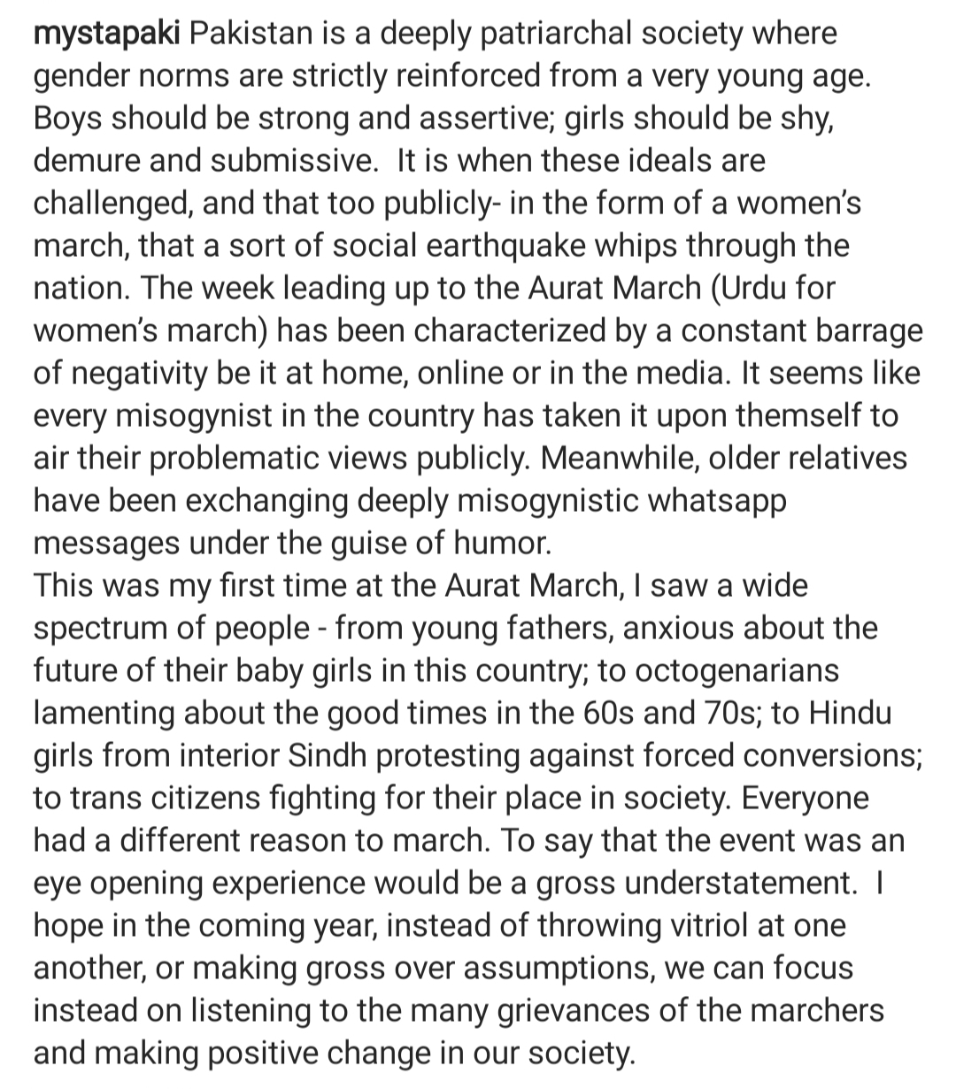 To mention two "extremes", lot of men who don't see point of this march or hate the 'vulgar' slogans against Islamic norms and values, survive on walayti p*rn (and perhaps prostitutes) and deny wives their Islamic rights. On the other hand, as someone pointed out on twitter, many of the elitist women who join the march won't practice what they preach and deny the rights of their maids. Hypocrisy in this culture knows no bounds. The actual cause disappears behind other issues and doesn't receive as much attention. Finding a balance proves to be quite impossible it seems.