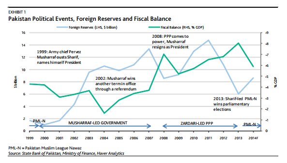 Both its fiscal balance and the level of its foreign reserves began to improve after Prime Minister Nawaz Sharif of the Pakistan Muslim League – Nawaz came to power in **May last year.