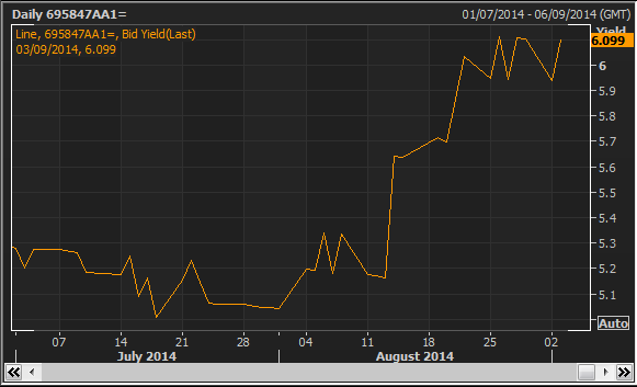 The yield on a **$500m bond **maturing in **2016 **rose since the protests started in early August, from lows at the beginning of the month of **5 percent to 6.1 percent **on Thursday:
