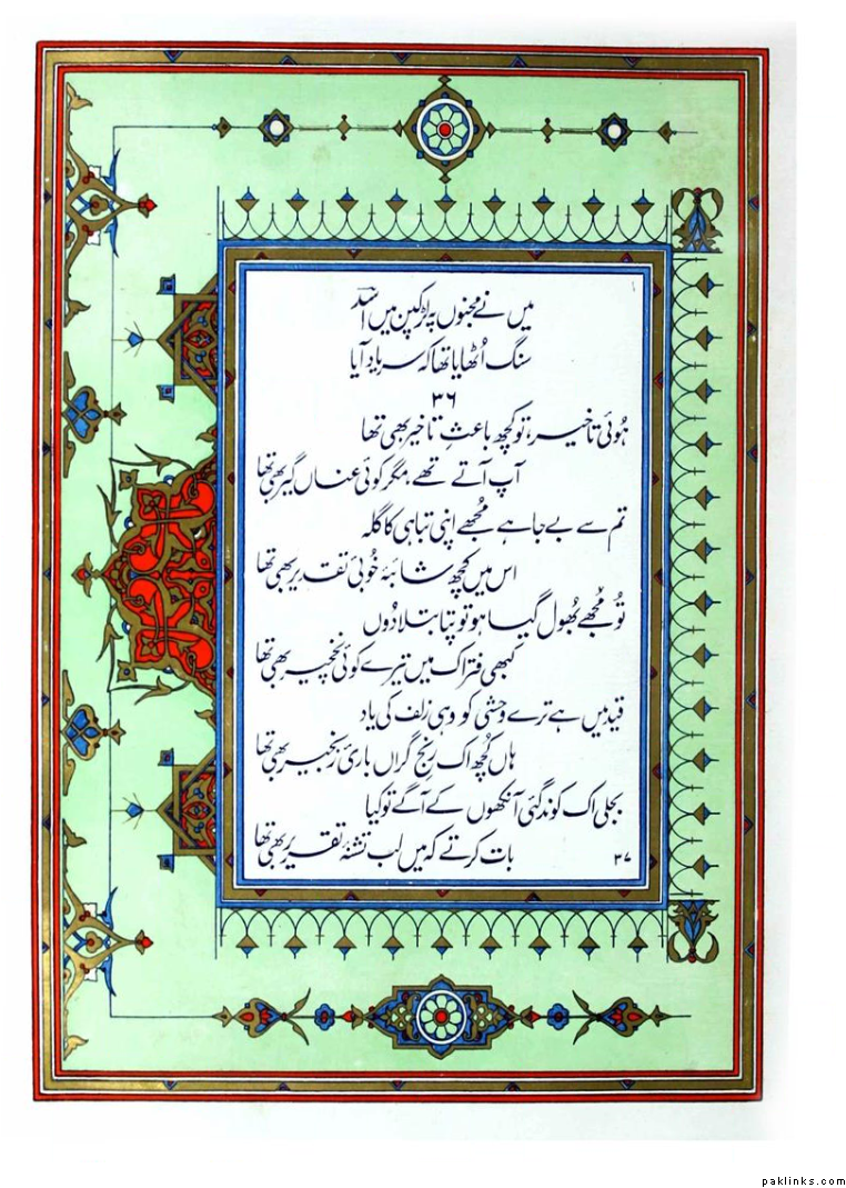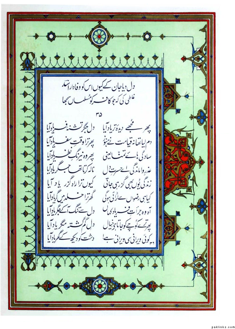 Although Ghalib himself was far prouder of his poetic achievements in Persian, he is today more famous for his Urdu ghazals. Numerous elucidations of Ghalib’s ghazal compilations have been written by Urdu scholars. The first such elucidation or Sharh was written by Ali Haider Nazm Tabatabai of Hyderabad during the rule of the last Nizam of Hyderabad. Before Ghalib, the ghazal was primarily an expression of anguished love; but Ghalib expressed philosophy, the travails and mysteries of life and wrote ghazals on many other subjects, vastly expanding the scope of the ghazal. This work is considered his paramount contribution to Urdu poetry and literature.